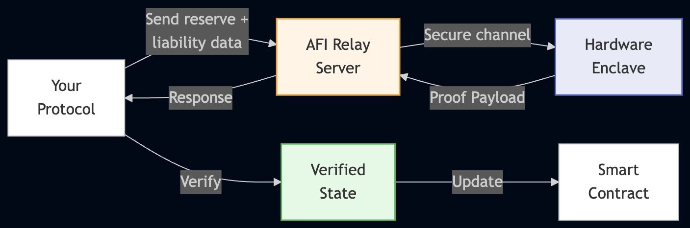 - Your protocol sends reserve and liability data to AFI's relay server via a single API call