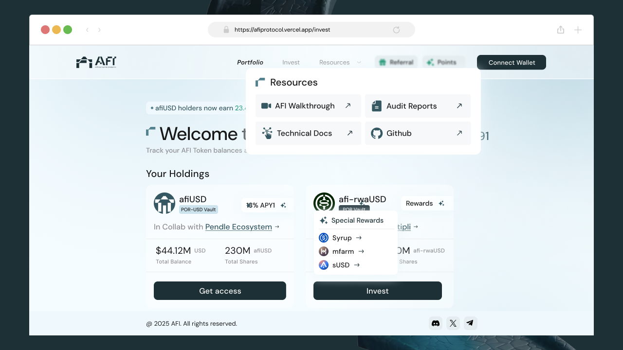 AFI builds Proof-of-Reserve infrastructure for Real-World Assets — unlocking institutional-grade yield that’s fully composable in DeFi.